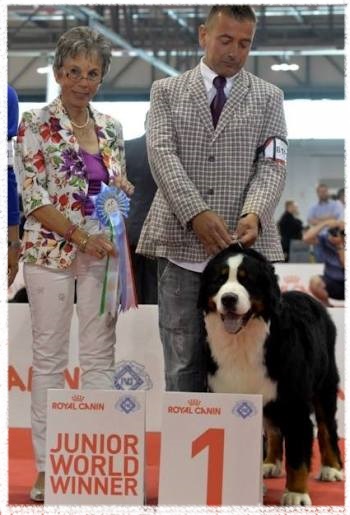 In classe campioni maschi erano iscritti 28 bernesi provenienti da tutta Europa e il sesto è un gran bel risultato visto il livello altissimo di campioni . La giudice giudicava sulla corsa e Jolly Joker ( sinceramente ) era con qualche chilino di troppo.... alla fine non riusciva a correre liberamente . In classe Campioni femmine ben 16 le Bernesi iscritte .... per me doveva rientrare nelle migliori quattro ... ma io sono di parte !! Alla grandissima la mia presenza a questa Mondiale come handler e “nonno” di Class First . Veio Park’s Class First figlio del MultiCh. LINKIN PARK (MultiCh.FRANKIEHINRG-MC x DOLCE NERA ) è diventato Giovane Campione Mondiale . Ho avuto il piacere di condurlo nel ring e il mix tra la sua bellezza e la mia perfetta condotta ci ha portato al successo ... Nonna Dolce Nera è fiera di avere dei figli e dei nipoti di così alto livello espositivo !!